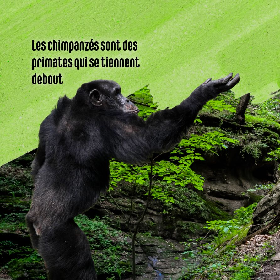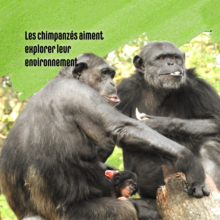 Les chimpanzés sont des primates qui se tiennent debout. Ils ont des mains agiles avec des doigts et un pouce mobile, leur permettant de grimper sur tout type d’arbre, de s’y équilibrer et de saisir et manipuler des objets avec précision. Leur cerveau est grandement développé et complexe, comme chez les humains. Les chimpanzés sont constamment à la recherche de nouvelles expériences. Ils inspectent les arbres, les branches, les feuilles et les objets qu’ils trouvent. Ils manipulent ces objets, les retournent, les jettent, les secouent et les explorent avec leurs mains et leurs pieds.