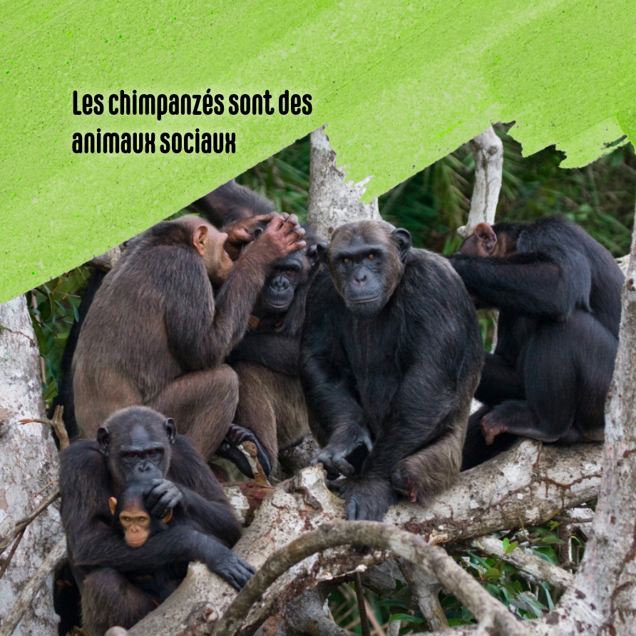 Les chimpanzés sont des animaux sociaux qui interagissent de manière complexe. Ils manifestent leur curiosité en explorant les relations entre eux, en jouant, en se peignant mutuellement et en se défendant contre les menaces. On les voit ici toujours en groupe. Un d’eux est manchot certainement arraché à un piège des chasseurs, il en est sorti avec une patte amputée.